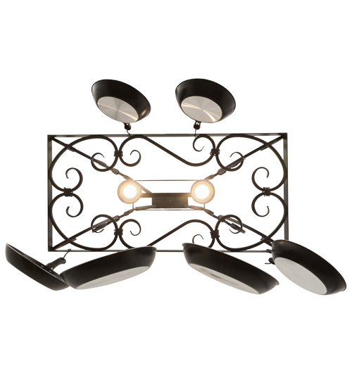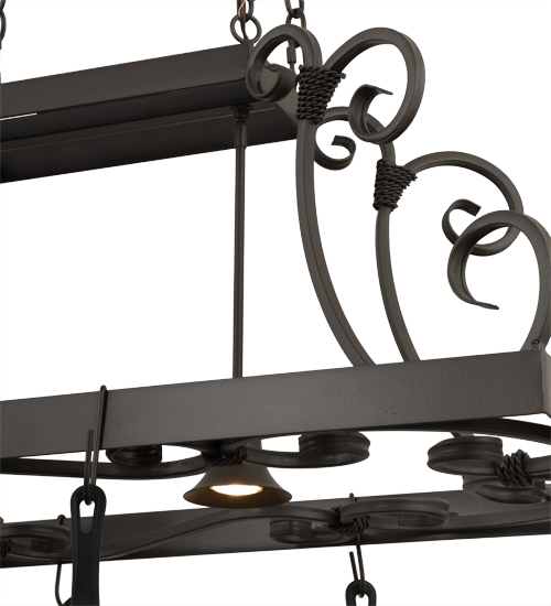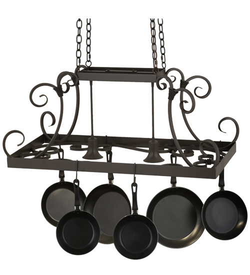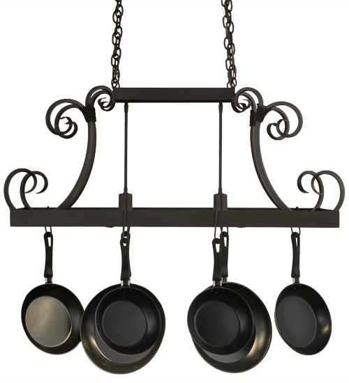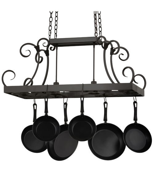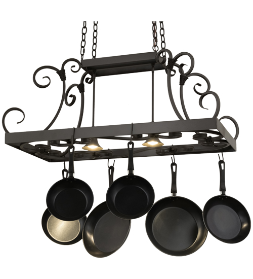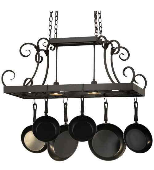 An upscale transitional lighting design, Caiden is highlighted with large scroll accents and a Timeless Bronze finished frame with hooks to display pots and pans for easy access in kitchens. Handcrafted by highly skilled artisans in our 180,000 square foot manufacturing facility in Yorkville, New York. Options include dimmable energy efficient lamping, as well as custom sizes, styles and colors. UL and cUL listed for damp and dry locations. (Cookware not included)