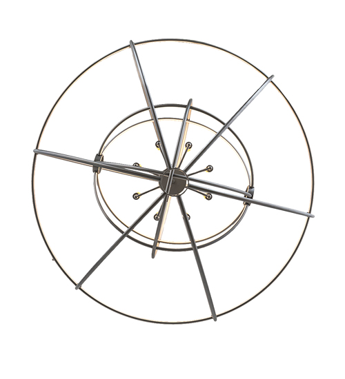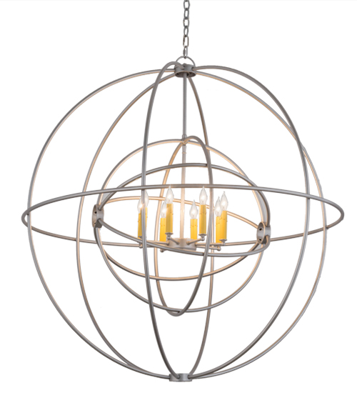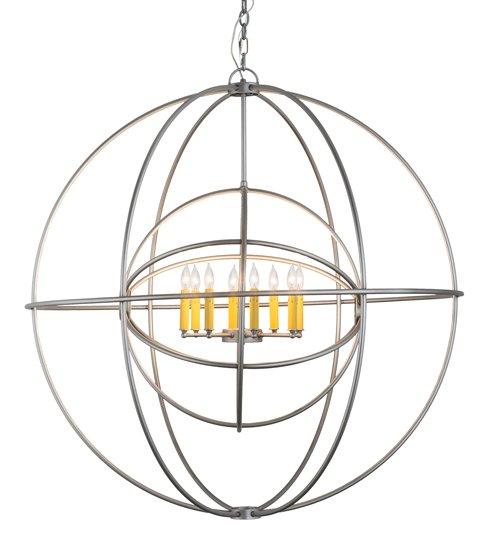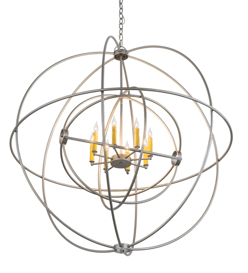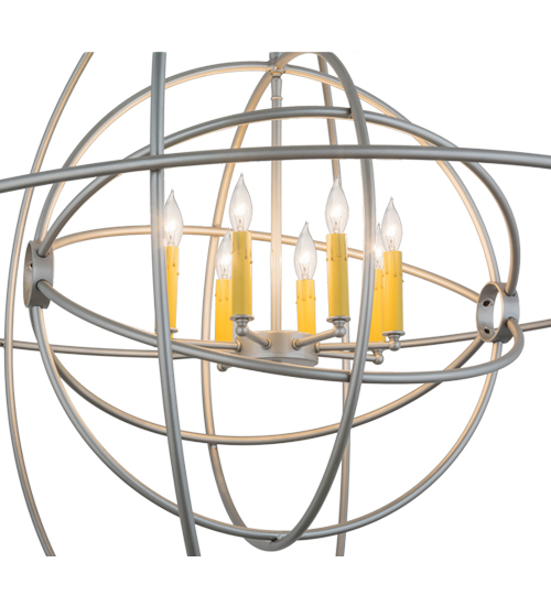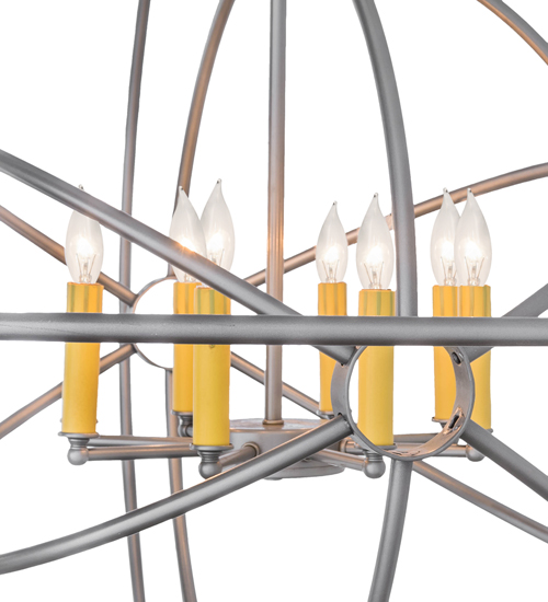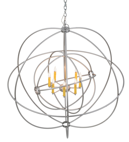 Like a complex gyroscopic structure, Nickel finished Solid Steel rings create a unique curvature pattern that evokes the illusion of revolutionary motion like a spinning gimbal rotating on its axis. The orbed frame envelopes a smaller frame similar to one that represents atomic energy, which wraps around an elegant 8-light faux Amber candelabra. Custom crafted in the USA, this fixture is available in custom colors, designs and sizes, as well as dimmable energy efficient lamping options. UL and cUL listed for damp and dry locations.