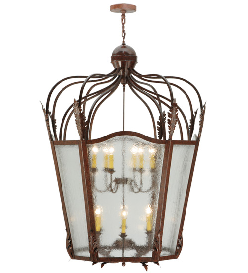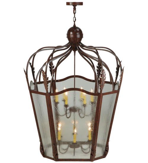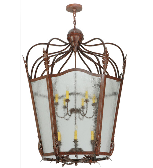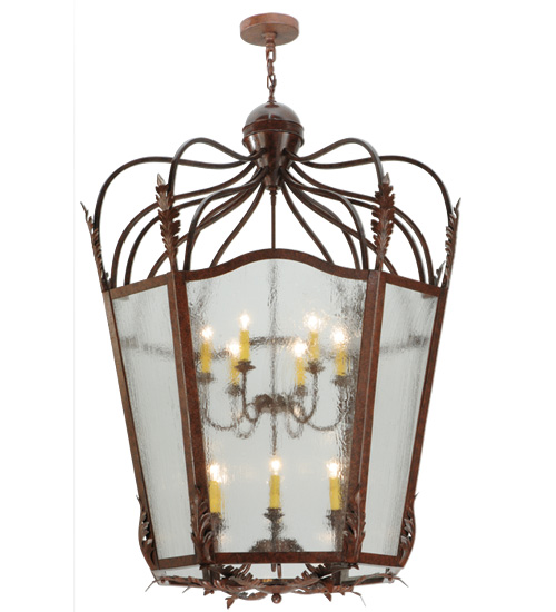 Utilizing a blend of timeless craftsmanship and classic design, the ever-popular Citadel brings home unsurpassed quality and shapely appeal. Evoking a dramatic effect, beautiful ambient light is evoked through Clear Seeded Glass which reveals two 6-light faux candelabras featured within this pendant. Citadel is enhanced with a dramatic design, Acanthus leaf accents and a frame featured in a Rusty Nail finish. The fixture is handcrafted by skilled artisans in our American factory in Upstate New York. Custom options include various sizes, colors, designs and dimmable energy efficient lamping. UL and cUL listed.