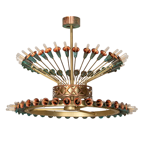 A magnificent masterpiece of Brass, Copper, and energy-efficient LEDs that speaks to drama, excitement, and celebration of beautiful lighting and design. Select this innovative lighting design, which features organically bent Brass Tubing finished in Brushed Brass. Beautiful Verdigris Copper finished socket cups, designed as Trumpet Lily flowers, are paired with 72 customer-supplied lamps. This massive two-tiered chandelier is separated with a Copper band featuring a saltire cross design. The fixture is ideal for illuminating entryways, lobbies, and ballrooms in hotels and other commercial lighting installations. The canopy and decorative banding accents are crafted of Copper. See the two complementary lighting fixtures: the 42″ Wide Coyle 36 Light Semi-Flushmount, model 274854, and the 60″ Wide Coyle 108 Light Chandelier, model 274097. The Coyle Chandelier is featured in our American-made, American-designed Coyle Chandelier Collection, which is manufactured in Yorkville, New York. UL and cUL listed for dry and damp locations.
