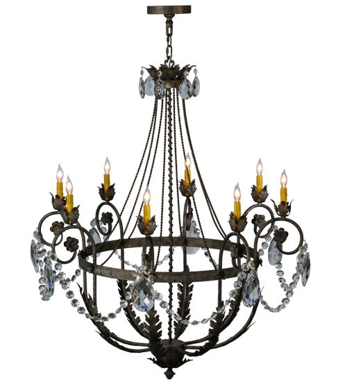 Exquisite styling and luxurious charm are reflected in this 8-light chandelier. This elegant Antonia Chandelier embraces 8 Amber faux candlelights which are enhanced with faceted crystal charms, scroll arms, Acanthus leaf accents and rich Corinth finished hand-forged Iron hardware. This chandelier features quality materials and hand detailed American craftsmanship perfected by years of time honored artistry, passed down from generations of highly skilled artisans. Custom sizes, styles, colors and dimmable energy efficient lamping options such as LED are available. The fixture is UL and cUL listed for damp and dry locations.