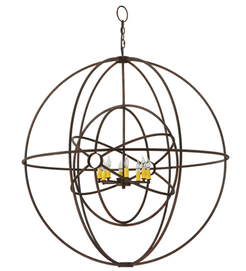 Like a complex gyroscopic structure, Rusty Nail finished metal rings create a unique curvature pattern that evokes the illusion of revolutionary motion like a spinning gimbal rotating on its axis. The orbed frame envelops a smaller frame similar to one that represents atomic energy, which wraps around an elegant Amber 8-light faux candelabra. Custom crafted in our 180,000 square foot manufacturing facility in the USA, this fixture is available in custom colors, designs, and sizes, as well as dimmable energy efficient lamping options. The 43-inch wide fixture is UL and cUL listed for damp and dry locations.