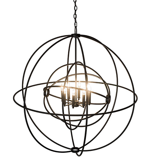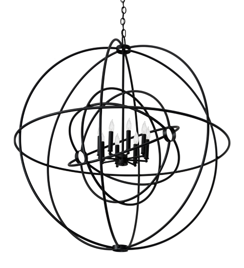 Like a complex gyroscopic structure, Textured Black finished steel rings create a unique curvature pattern that evokes the illusion of revolutionary motion like a spinning gimbal rotating on its axis. The orbed frame envelopes a smaller frame similar to one that represents atomic energy, which wraps around an elegant faux 8-light faux candelabra. Custom crafted in the USA, this fixture is available in custom colors, designs and sizes, as well as dimmable energy efficient lamping options. The chandelier is UL and� cUL listed for damp and dry locations.