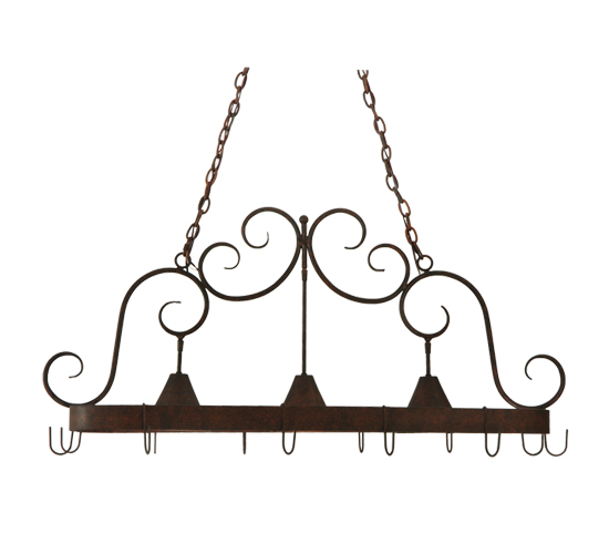 An upscale design that integrates form and function, the Elana lighted pot rack is highlighted with large scroll accents and a Cajun Spice finished frame with hooks to display fine cookware for easy access in kitchens. Three luminaires illuminate counter surfaces, tabletops, islands and architectural accents. Handcrafted in the USA by our highly skilled artisans, this Hand-forged Iron fixture is available in custom sizes, styles, colors and energy-efficient lamping options such as LED. The fixture is UL and cUL listed for damp and dry locations.