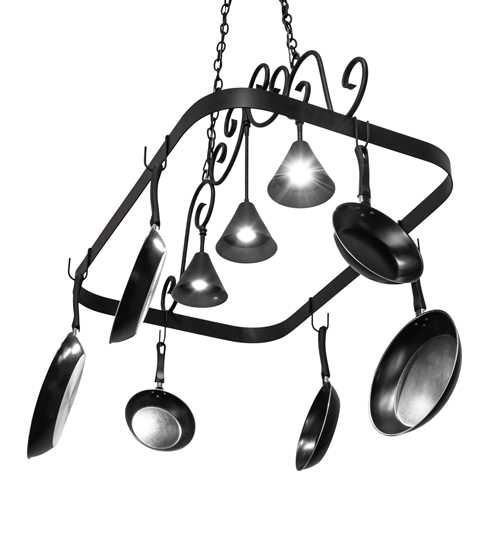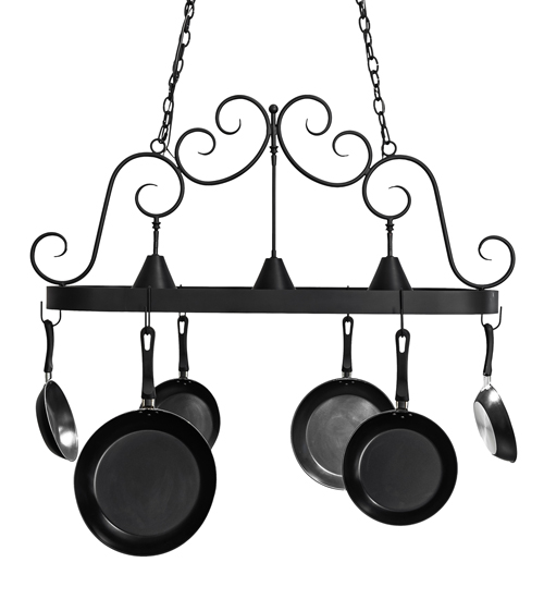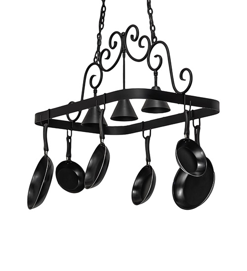 An upscale design that integrates form and function, Elana is highlighted with Hand-Forged Iron scroll accents and a Blackwash finished frame with hooks to display fine cookware for easy access in kitchens. Three luminaires provide optimal downlighting on counter surfaces, tabletops, islands and architectural accents. Overall height ranges from 26 to 56 inches as the chain easily adjusts in the field. The Elana Pot Rack is featured in our American-made, American-designed, handcrafted Lighted Pot Rack Collection. Manufactured in Yorkville, New York. UL and cUL listed for dry and damp locations. (Cookware not included)