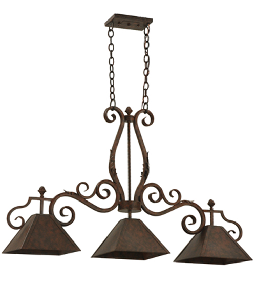 A strikingly elegant and rich, timeless design. The Pedra Pendant features three metal shades in an Antique Rust finish. The shades are enhanced with Hand-Forged Iron scrollwork. Ideal for placement above billiard tables, islands, bars, counters and tables. The overall height ranges from 33 to 103 inches as the chain length can be easily adjusted in the field to accommodate your specific lighting needs. Handcrafted by highly skilled artisans in our 180,000 square foot manufacturing facility in Yorkville, New York. Shade colors, metal finishes and fixture sizes can be customized to your needs. UL and cUL listed for dry and damp locations.