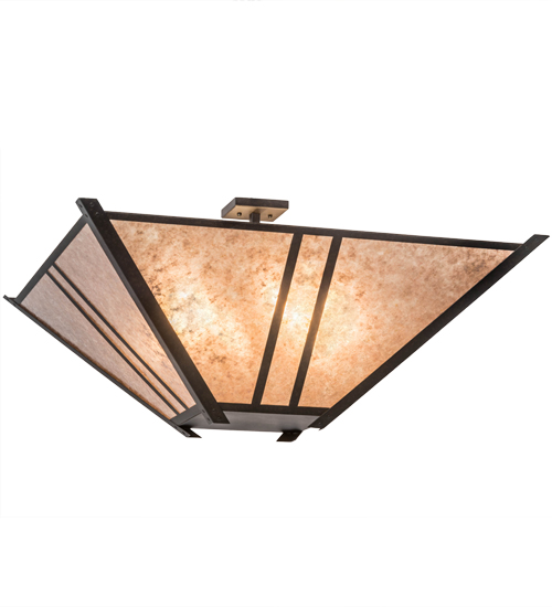 Evocative of the Craftsman period. This handsome ceiling fixture adds warmth and authentic appeal to interior spaces while creating a visually pleasing experience with welcoming ambient light. Stunning Silver Mica is complemented with a a Mission styled straight line design. The shade is enhanced with decorative accents and hardware featured in a Chestnut finish. Custom crafted in our 180,000 square foot manufacturing facility in Yorkville, New York. Lens colors, metal finishes and fixture sizes can be customized to your needs. UL and cUL listed for dry and damp locations.