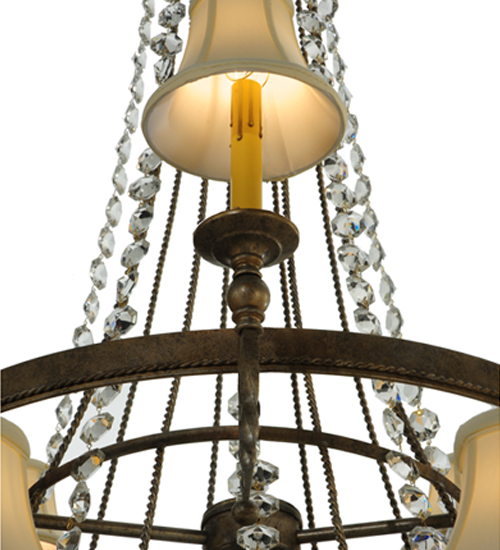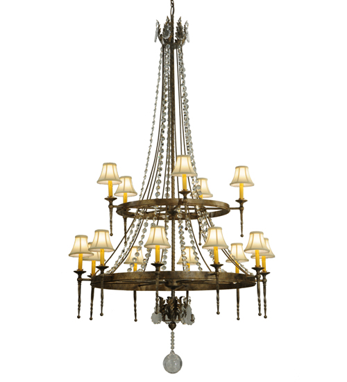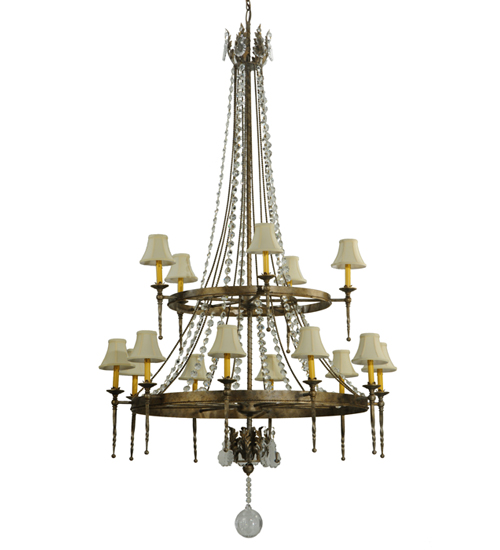 A rich luxurious massive beauty. The Amaury chandelier blends classic and timeless styling. This chandelier is the perfect choice for today’s interiors and adds a finishing touch to living areas, entryways, lobbies and other spaces.15 Ivory faux candlelights are crowned with Cream Textrene Shades and complemented with Acanthus leaf accents in a Corinth finish. Overall height ranges from 89 to 160 inches as chain length can be easily adjusted in the field. Handcrafted in our 180,000 sq ft manufacturing facility. Shade styles, metal finishes and pendant sizes can be customized. UL and cUL listed for dry and damp locations however we do not recommend installing it in spaces that experience a large amount of moisture due to the fabric shades.