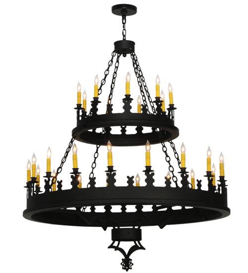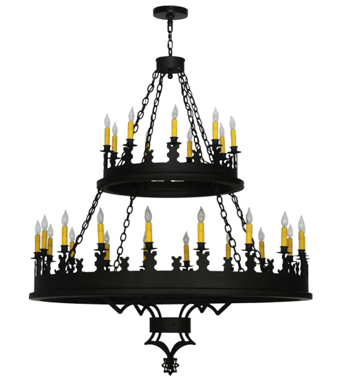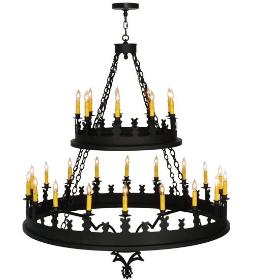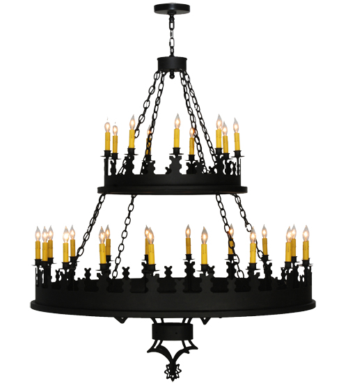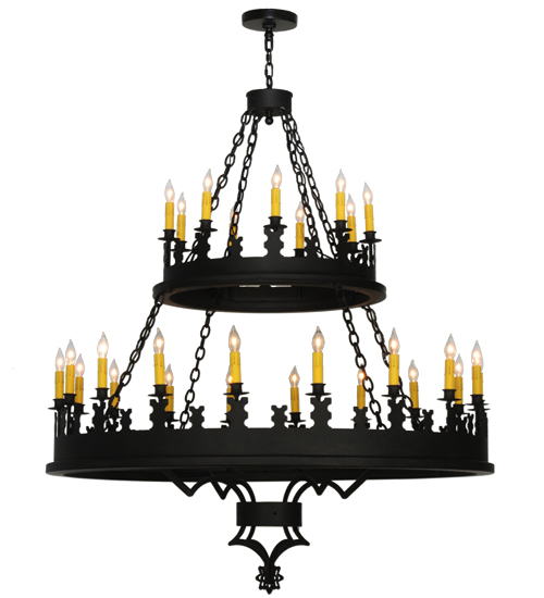 Blending Gothic and Rustic design influences. Yosemite presents 27 Ivory faux candlelights on decorative bobeches. Two rugged tiers are hand finished in a bold Costello Black. The overall height ranges from 62 to 205 inches as the chain length can be easily adjusted in the field to accommodate your specific lighting needs. Ideal for lighting lobbies, entryways and other large spaces in residential, hospitality and commercial settings. Handcrafted by highly skilled artisans in our 180,000 square foot manufacturing facility in Yorkville, New York. Shade colors, metal finishes and fixture sizes can be customized to your needs. UL and cUL listed for dry and damp locations.