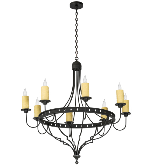 An elegant statement piece of distinction. The Bottini Chandelier features 8 Ivory faux candlelights aligned around the pierced ring which is hand finished in Wrought Iron. The overall height ranges from 52 to 136 inches as the chain length can be easily adjusted in the field to accommodate your specific lighting application needs. Handcrafted by highly skilled artisans in our 180,000 square manufacturing facility in Yorkville, New York. Candlelight colors, metal finishes and fixtures sizes can be customized to meet your needs. UL and cUL listed for damp and dry locations.