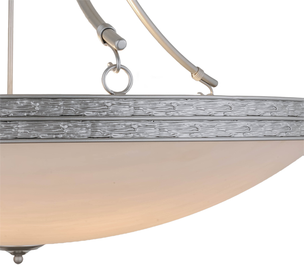 A striking transitionally styled ceiling fixture for residential, hospitality and commercial applications. Dionne features a stunning, versatile look with a Whitestone Idalight shade that is complemented with hardware and decorative accents finished in a Nickel finish. The overall height ranges from 53 to 124 inches as the chain length can be easily adjusted in the field to accommodate your specific lighting application needs Handcrafted in our 180,000 square foot manufacturing facility in Yorkville, New York. Shade colors, metal finishes and fixture sizes can be customized to your needs. UL and cUL listed for dry and damp locations.