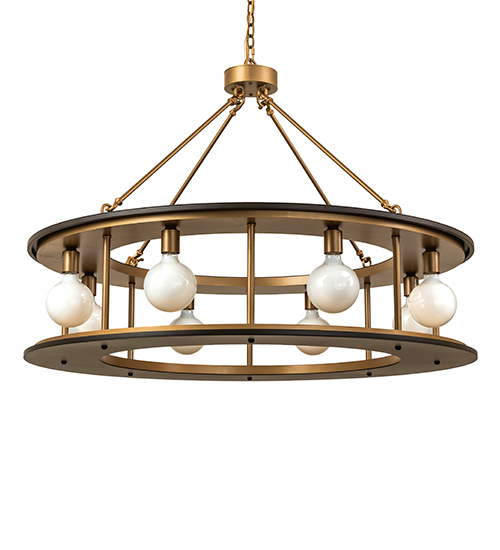 The Reginald Pendant features two curvaceous rings hand-finished in Gold Metallic on the interior and Oil Rubbed Bronze on the exterior. Eight White Glass Orb-shaped lamps provide beautiful ambient illumination. The overall height ranges from 38 to 61 inches as the chain adjusts easily in the field to meet your exact lighting specifications. Place the ceiling fixture over kitchen and dining tables and entryways to create a dramatic design statement in lodges, log and timber frame homes, camps, and other residential and hospitality locations. The Reginald 8 Light Pendant is included in our American-made, American-designed, handcrafted Transitional Lighting Collection and manufactured in Yorkville, New York. UL and cUL listed for dry and damp locations. Featured within the new home of Utica’s award-winning The Tailor and the Cook Restaurant.