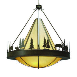 Bring the Great Outdoors indoors with charming Bears, Pine Trees and Elks silhouettes displayed around the perimeter of this breathtaking pendant. The stunning Creme Carrare Idalight diffuser is complemented with decorative accents, frame and hardware in a matching Coffee Bean finish. Handcrafted in the USA by highly skilled artisans at the foothills of the Adirondack Mountains in Upstate New York. Energy efficient lamping options such as LED are available. This 48-inch wide pendant is UL listed for damp locations.