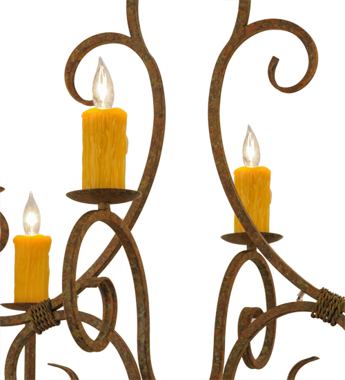 Clifton offers a rich, modern twist on a classic, elegant lighting design. This opulent, sumptuous chandelier features an Organic Rust finished steel frame with 10 Amber faux candlelights perched on bobeches, which is enhanced with scroll arms and accents. Handcrafted in the USA, this fixture is available in custom designs, finishes and sizes, as well as energy efficient lamping options such as LED. The chandelier is UL and cUL listed for damp and dry locations.