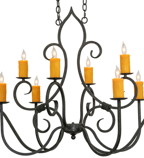 Clifton offers a rich, modern twist on a classic, elegant lighting design. This opulent, sumptuous chandelier features an Antique Iron Gate finished steel frame with 10 Amber faux candlelights perched on bobeches and enhanced with scroll arms and accents. Handcrafted in the USA, this fixture is available in custom designs, finishes and sizes, as well as energy efficient lamping options such as LED. The chandelier is UL and cUL listed for damp and dry locations.