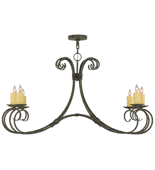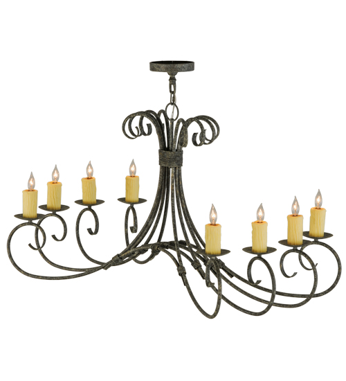 Graceful scroll like waves of metal with matching accents above creates graceful charm and visual interest. The scrolled arms embrace round bobeches with 8 Ivory faux candlelights that deliver a soft glow. The hardware and frame are featured in a Bold Blackwash finish. Handcrafted in our 180,000 manufacturing facility in Yorkville, NY. The overall height of this pendant ranges from 32 to 103 inches as the chain length can be easily adjusted in the field to accommodate your specific lighting application needs. Available in custom sizes and finishes. UL and cUL listed for damp and dry locations.