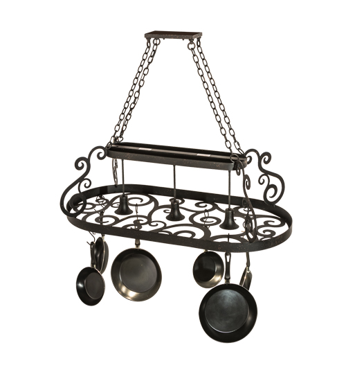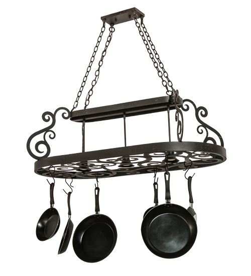A transitional functional design, this elegant lighted pot rack showcases scroll accents and hardware in a Euro Cafe finish. The frame is designed with hooks to display fine cookware and accessories for easy access to fine kitchens and other culinary spaces. The overall height of this fixture ranges from 25 to 83 inches and the chain length can be easily adjusted in the field to accommodate your specific lighting application needs. Three Customer supplied E26 Base LED MR16 Downlights to illuminate countertops, tabletops and other surfaces. Handcrafted by expert artisans in our 180,000 square foot manufacturing facility in Yorkville, NY. Custom sizes, styles, finishes, and lamping available. UL and cUL listed for dry and damp locations. (Cookware not included)