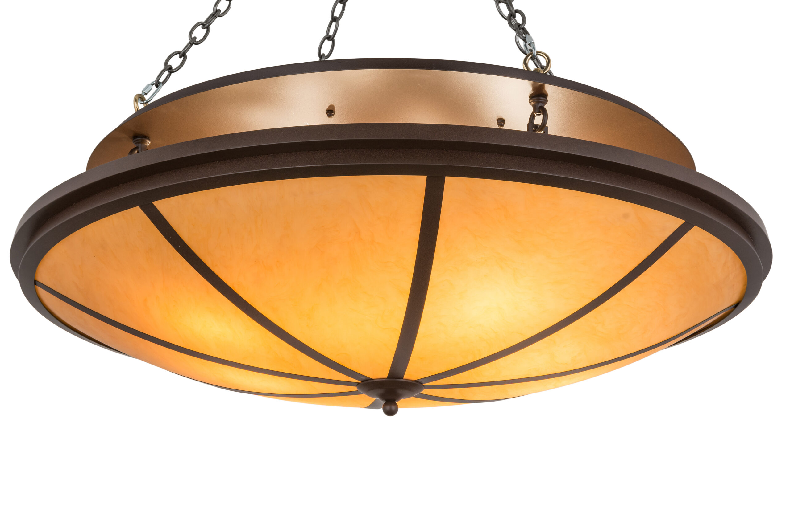 Revealing an elegant look with this distinctive fixture, Commerce features an Amber Quartz Idalight shade, which is complemented with decorative accents, fram and hardware in a Cafe Noir finish. Handmade by highly skilled artisans in the USA. Custom colors, styles, sizes and dimmable energy efficient lamping options such as LED are available. The 45.5-inch wide fixture is UL and cUL listed for dry and damp locations.
