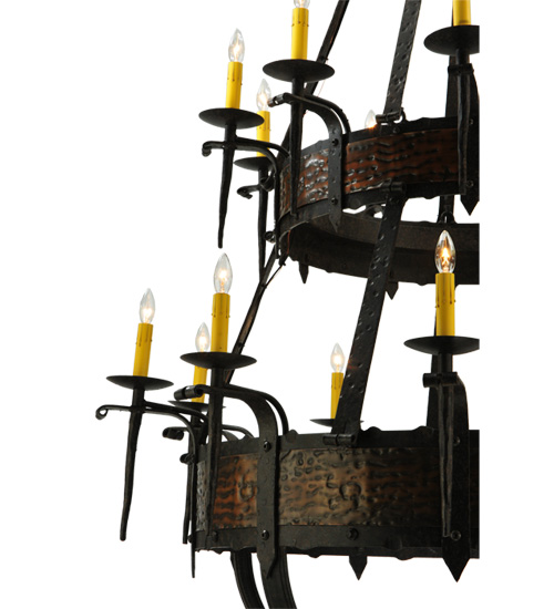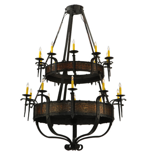 Hand hammered Metal Banded belts embellish two Blackened Copper finished tiers of this breathtaking chandelier. The fixture is enhanced with a Coffee Bean finish. 20 Ivory faux candlelights embraced by delicate bobeches are attached to gracefully curved arms and provide beautiful ambient lighting. Ideal for illuminating lobbies, ballrooms and large spaces in homes, hotels, retailers and other commercial locations. Overall height ranges from 72 to 190 inches as the chain length can be easily adjusted in the field to accommodate your specific lighting application needs. Handcrafted in our 180,000 square foot manufacturing facility in Yorkville, NY. Fixture designs, metal finishes and chandelier sizes can be customized to meet your needs. UL and cUL listed for damp and dry locations.