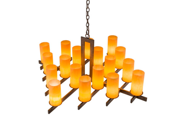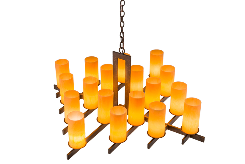Expert craftsmanship and a distinctive elegance come to light with a luxurious rustic Chandelier that entices all to see. 18 Cylindrical luminaires feature stunning Amber Quartz Idalight which is complemented with a sturdy crossbar frame and hardware in a Gilded Tobacco finish. Custom crafted in our 180,000 square foot manufacturing facility in Yorkville, New York. Custom options include various sizes, colors, designs and dimmable energy efficient lamping options. UL and cUL listed for damp and dry