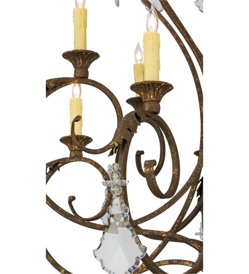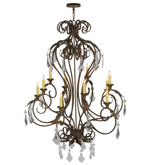 Offering luxurious charm and elegance, Josephine features a sophisticated chandelier design with Hand-forged scrolled arms, finial and Acanthus leaf accents in a stunning Pompeii Gold finish. The exquisite chandelier features 10 coordinating Pompeii Gold finished candlelights perched on decorative bobeches for beautiful ambient illumination and complemented with Crystal Pendalogues. Custom crafted in the USA, this lovely fixture is available in custom sizes, styles and colors, as well as dimmable energy efficient lamping options such as LED. The chandelier is UL and cUL listed for dry and damp locations.