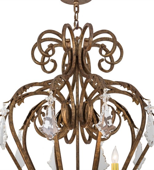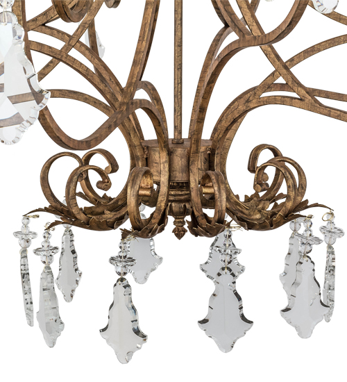 Offering a luxurious charm and elegance, Josephine features an elaborate design with scrolled steel arms and accents in a stunning Spanish Gold finish. The exquisite chandelier reveals 10 Amber faux candlelights perched on bobeches and adorned with metal acanthus leaves and crystal droplets. Custom crafted in the USA, this chandelier is available in custom sizes, styles and colors, as well as dimmable energy efficient lamping options. The chandelier is UL and cUL listed for damp and dry locations.