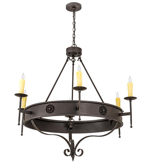 Integrating a rich charm and artistic look, the Lorenzo sturdy Hand-forged Iron chandelier features floral medallions and is adorned with 7 exquisite Ivory faux candlelights perched on bobeches with long ballpoint arms. The fixture is enhanced with hardware and a scrolled finial featured in a warm Chestnut finish. The fixture is ideal for entryways, dining areas, lobbies and other rooms in a variety of residential and commercial settings. The chandelier is handcrafted by highly skilled artisans in the USA. Options include dimmable energy efficient lamping, as well as custom sizes, styles and colors. The 48-inch wide chandelier is UL and cUL listed for damp and dry locations.