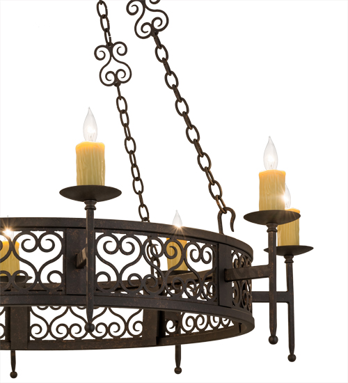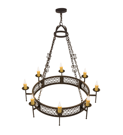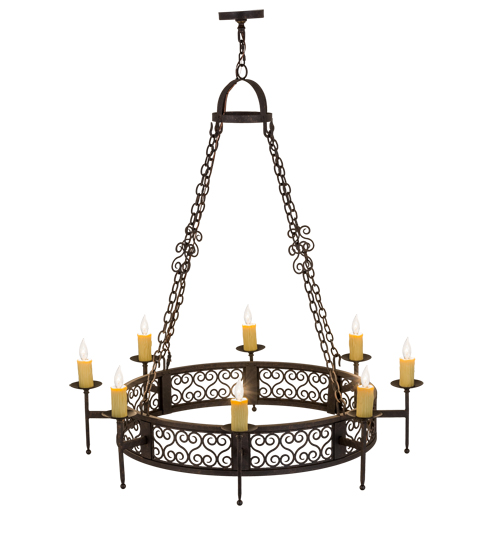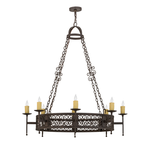 An elegant chandelier design comes to light with all of the sparkle and glamour of a regal castle, conjuring up images of romantic bygone days. Eight�faux Ivory colored candlelights perched on bobeches with ballpoint accents are embraced by linear arms that are attached to a rotund frame underscored with a series of multi scroll motifs, one for each luminaire. The exquisite frame, hardware and hanging chain that supports this lovely fixture are featured in a Copper Rust finish. Handcrafted in the USA, custom sizes, styles, colors and dimmable energy efficient lamping options are available. UL and cUL listed for damp and dry locations.