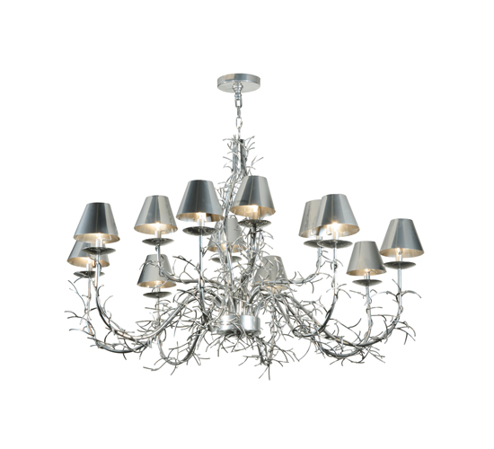 Expert artisanship embraces Mother Nature. A Grand styled 12 light chandelier with Extreme Chrome Candelabra lamp covers are crowned with color coordinated shades and appear to bud and grow from matching metallic twigs and branches. Custom crafted by highly skilled artisans in our manufacturing facility in Yorkville, NY at the foothills of the Adirondack Mountains. Custom sizes, styles and colors are available, as well as dimmable energy efficient lamping options such as LED. The 48-inch wide chandelier is UL and cUL listed for dry and damp locations.