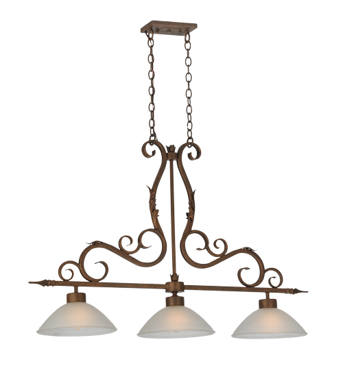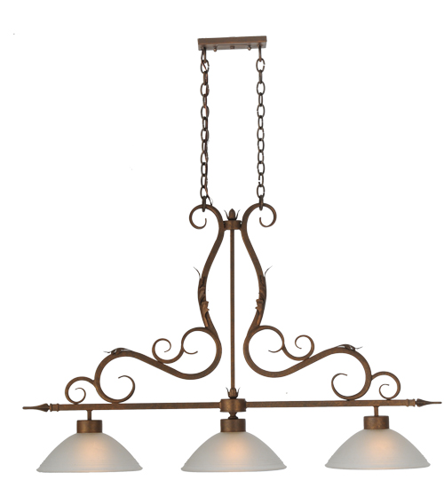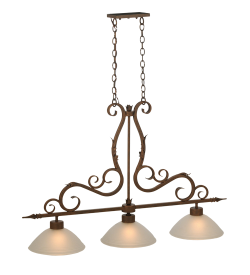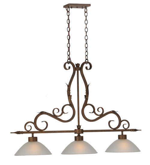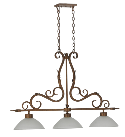A stylish design statement is evoked in the versatile Zamora pendant. Three White Scavo Glass shades are embraced by a Scrolled frame and hardware featured in an Antique Rust finish. The elegant fixture is perfect for illuminating islands, counters, billiard tables, bars and other spaces. Handcrafted by highly skilled artisans in the Yorkville, NY manufacturing facilities, this linear pendant is available in custom sizes, styles, colors and dimmable energy efficient lamping options such as LED. This lovely 48.5-inch long fixture is UL and cUL listed for dry and damp locations.