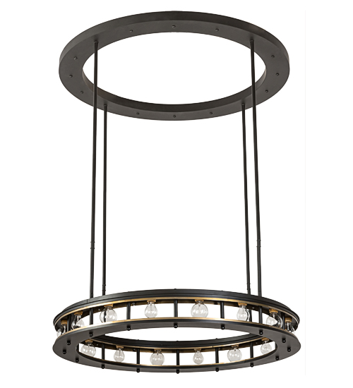 Inspired by the popular Minimalist Movement, Alva Cilindro features a round profile with 16 Customer Supplied Medium base G25 LED lamps. The curvaceous frame with hardware are featured in a Solar Black finish, with the lower ring’s interiors finished in Matte Buttered Brass. Handmade by skilled artisans in Yorkville, NY, this Impressive fixture is available in custom sizes, styles and finishes. Dimmable energy efficient lamping options such as LED are offered. The 49-inch wide pendant is UL and cUL listed for dry and damp locations.