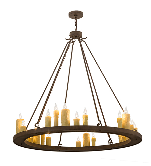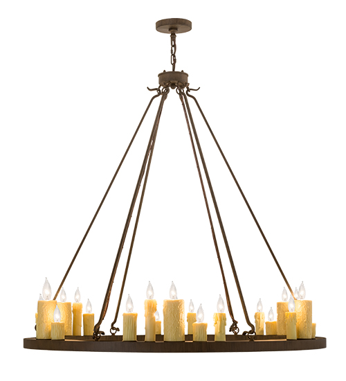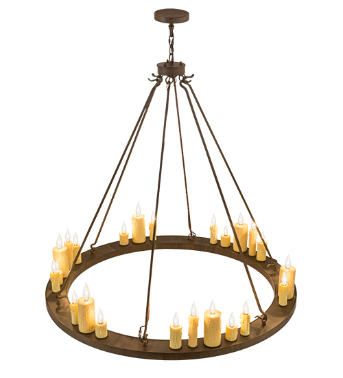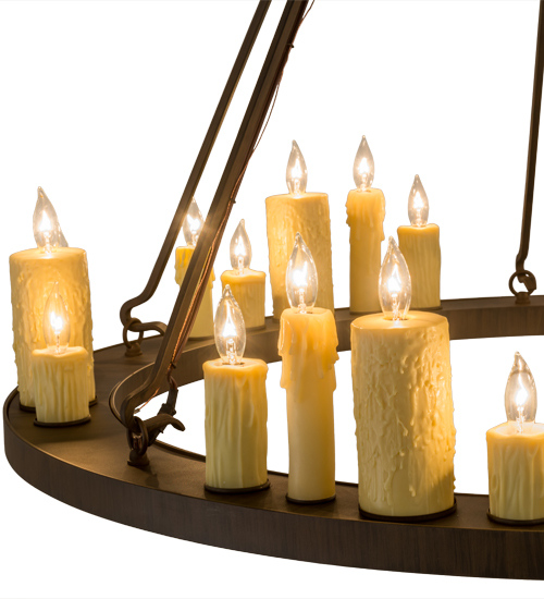 Create a warming, welcoming effect with this distinctive fixture for an entryway, grand dining room or lobby. This exquisite chandelier features the charm of 24 faux Ivory candlelights paired with the strength of a solid steel ring shaped frame finished in a Classic Rust hue. Custom crafted by artisans at our manufacturing facility in the USA, this fixture is available in custom colors, styles and sizes,as well as dimmable, energy efficient lamping. UL and cUL listed for dry and damp locations.