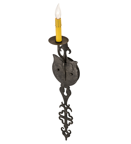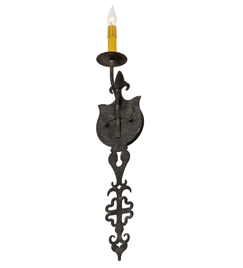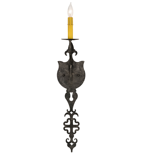 Ornate hand-forged metalwork and a medallion styled backplate create a rich, luxurious look for Merano. This high-styled wall fixture features a single faux candlelight perched on a bobeche and enhanced with a stylized Fleur-de-lis and scrolled accents featured in a Smoke finish. This sconce is ideal to complement a variety of architectural styles for today’s interiors. Custom crafted in the USA, this fixture is offered in custom sizes, finishes and styles, as well as energy efficient lamping options such as LED. This wall luminaire is UL and cUL listed for damp and dry locations.