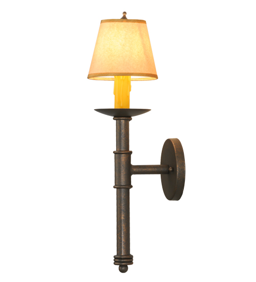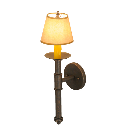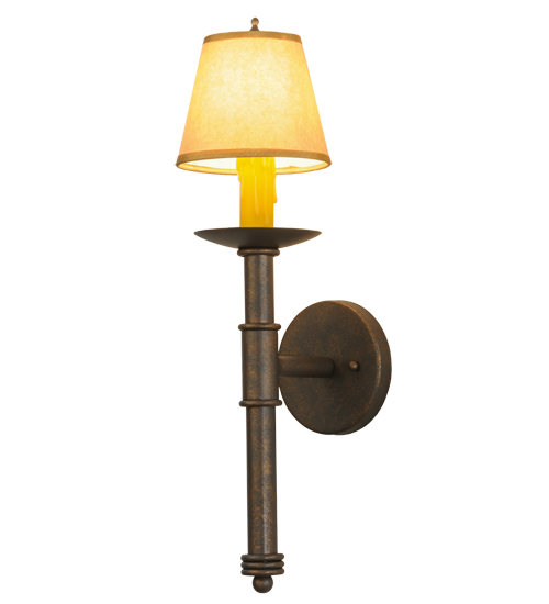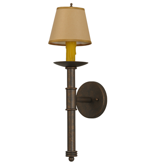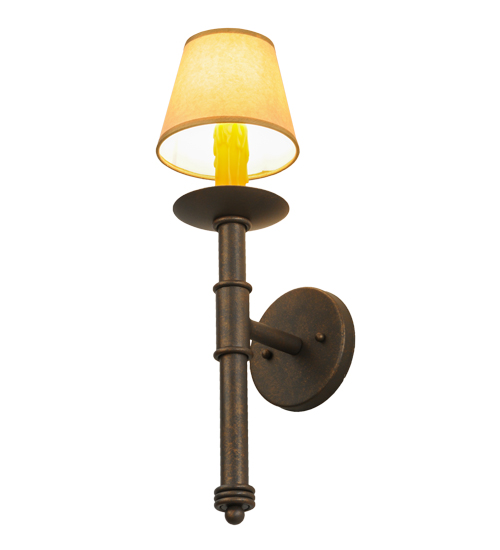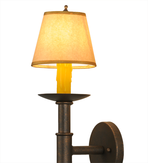 Designed as a stunning accent for any room or corridor, this wall sconce features a Natural Parchment shade perched on an Ivory faux candlelight and bobeche with telescopic-styled accents. This fixture offers decorative hardware in a Gilded Tobacco finish. The Amada Wall Sconce is included in our American-made, American-designed, handcrafted Transitional Collection and manufactured in Yorkville, New York. UL and cUL listed for dry and damp locations; however, we do not recommend installing it in spaces that experience a large amount of moisture due to the Parchment shade.