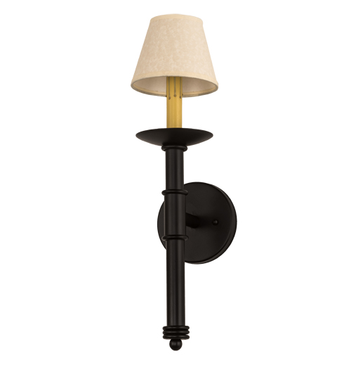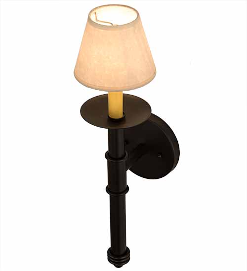 An Ivory faux candlelight is crowned with a Faux Leather shade and perched on a bobeche atop of a telescopic base with a ballpoint and embraced by a round backplate. The hardware is featured in a Blackwash finish. The Amada Wall Sconce is featured in our American manufactured, American designed Traditional Lighting Collection. Manufactured in Yorkville, NY. UL and cUL listed for dry and damp locations however we do not recommend installing it in spaces that experience a large amount of moisture due to the fabric shades.