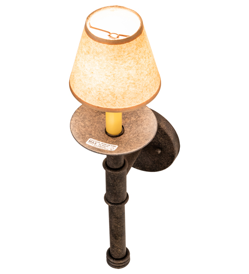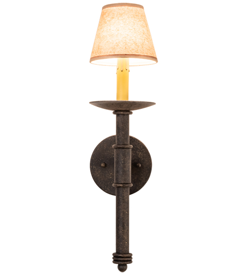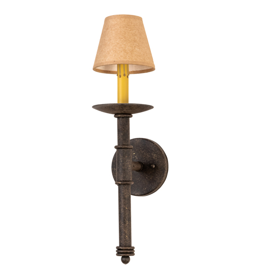 Designed as a dramatic accent for any room or corridor. This exquisite wall sconce features a Parchment shade crowning an Ivory faux candlelight and bobeche with telescopic styled accents. This fixture offers decorative hardware in an Antiquity finish. Custom crafted by highly skilled artisans in our 180,000 square foot manufacturing facility in Yorkville, New York. Shade colors, metal finishes and sizes can be customized. UL and cUL listed for dry and damp locations however we do not recommend installing it in spaces that experience a large amount of moisture due to the fabric shade.