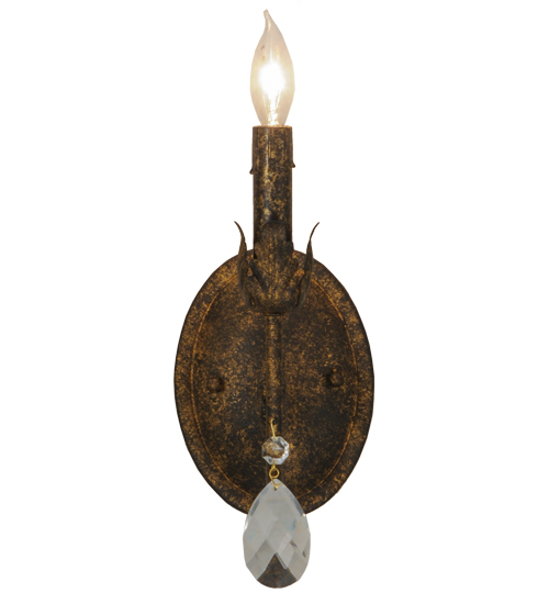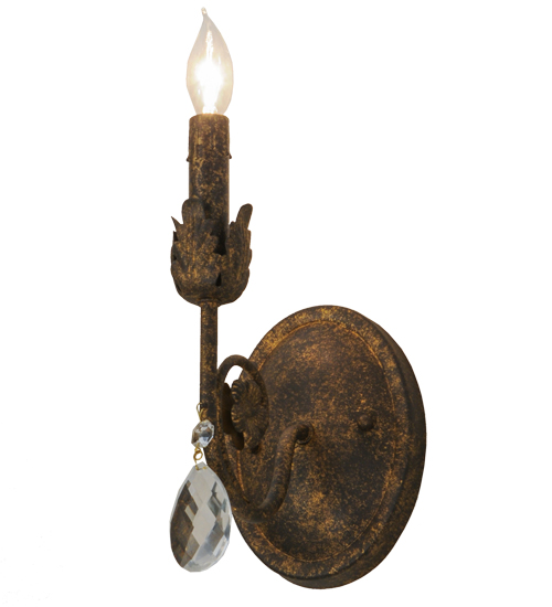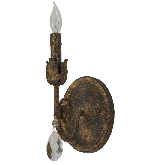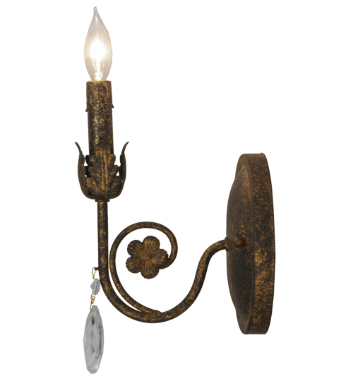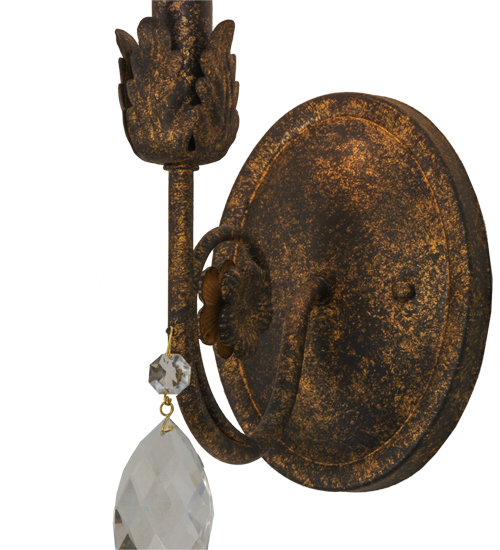 Exquisite styling and luxurious charm are reflected in the Antonia Wall Sconce, which is adorned with a faux candlelight and Hand-Forged Iron Hardware featured in an Old Gold finish. The fixture is enhanced with a floral bobeche, scrolled arm and Crystal droplet accent. The fixture features quality materials and hand detailed American craftsmanship perfected by years of time honored artistry, passed down from generations of highly skilled artisans. Custom sizes, styles, colors and dimmable energy efficient lamping options such as LED are available. The fixture is UL and cUL listed for damp and dry locations.