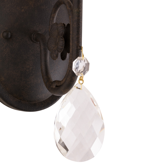 Exquisite styling and luxurious charm are reflected in the faceted crystal charm, scroll arm and fanciful Chestnut finished hardware. This sconce features quality materials and hand detailed American craftsmanship perfected by years of time honored artistry, passed down from generations of prolific artisans. Custom sizes, styles, colors and dimmable energy efficient lamping options are available.