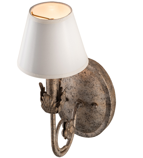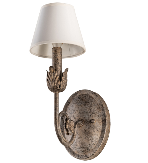 Exquisite styling and luxurious charm is reflected in this Antonia wall sconce. This fixture combines faceted Hand-Forged Iron scroll arm, Acanthus leaves and rich Corinth finished Hand-Forged Iron Hardware. The fixture features a Corinth finished faux candlelight crowned with a White Parchment shade to deliver ambient illumination. Handcrafted by highly skilled artisans in our 180,000 square foot manufacturing facility in Yorkville, New York. Custom sizes, styles, colors and dimmable energy efficient lamping options such as LED are available. The chandelier is UL and cUL listed for damp and dry locations.