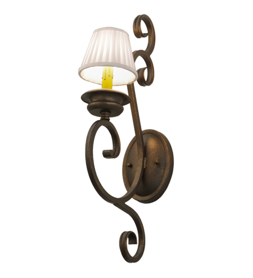 Beauty and grace come to light with this elegant wall sconce. The luminaire is highlighted with an exquisite Hand-Forged Iron Scrollwork design. A faux candlelight crowned with a White Pleated Tapered Textrene Shade is perched on a distinctive bobeche in a Gilded Tobacco finish. This classic fixture is perfect to illuminate hallways & other rooms in a variety of residential, hospitality and commercial spaces. Handcrafted in our 180,000 square foot manufacturing facility in Yorkville, NY. Shade colors, metal finishes and fixture sizes can be customized to meet your lighting needs. UL & CUL listed for dry and damp locations however we do not recommend installing it in spaces that experience a large amount of moisture due to the fabric shade.