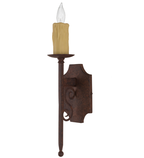 A rich exquisite look is evoked by the Tuscano Wall Sconce. A single faux Ivory candlelight adorns a bobeche with a long stem ball point accent, which is complemented with a scrolled arm and hardware featured in a Rusty Nail Textured finish. This fixture is custom crafted by our artisans in the USA. Custom lighting fixtures are offered with multiple candlelights as well, and in a variety of finishes, styles and energy efficient lamping options.