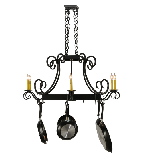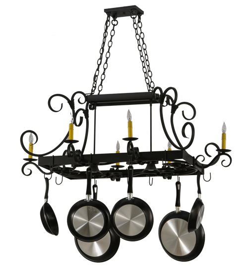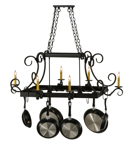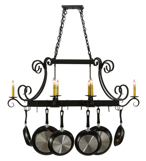 An upscale transitional lighting design, Caiden is highlighted with large scroll accents and a Blackwash finished frame with hooks to display fine cookware for easy access in kitchens. 6 Ivory faux candlelights provide beautiful ambient illumination while 2 downlights deliver functional lighting on surfaces below. Handmade by highly skilled artisans in the USA. Custom sizes, designs, finishes and dimmable lamping options such as LED are available. The 50-inch long fixture is UL and CUL listed dry and damp locations. (Cookware not included)