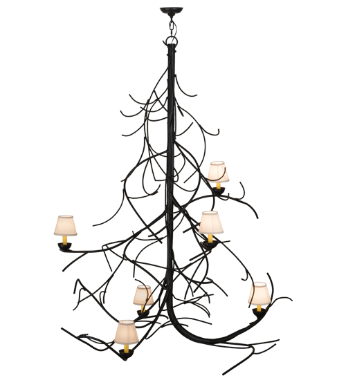 Like a wise old tree asleep in the cold winter woods, the Winter Solstice chandelier is an abstract expression of light that is perfectly poetic. Intricacies abound with long Black finished branches hibernating until the light from creamy colored Natural Linen shades on bobeches provides a warm embrace. Custom crafted by artisans at the foothills of New York’s Adirondacks, the fixture is a unique Nature-inspired lighting design.