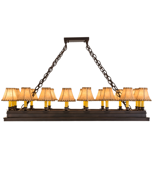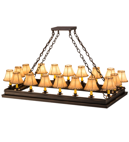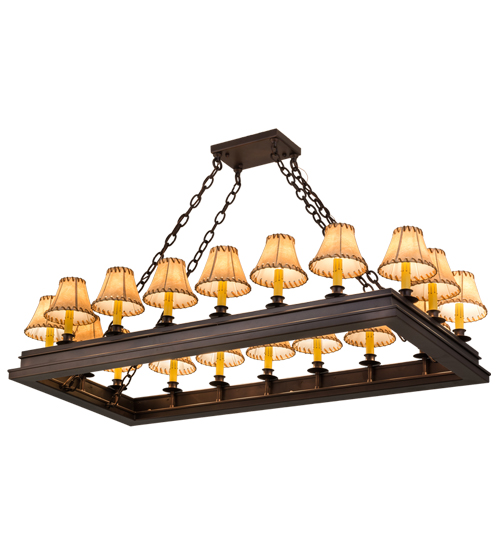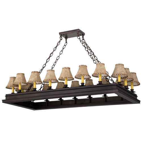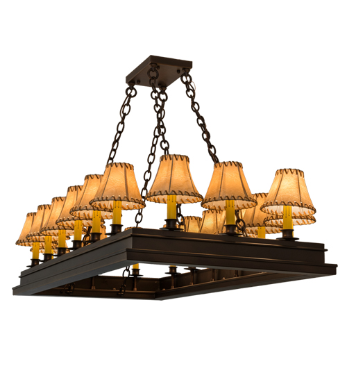 Inspired by the Arts and Crafts Movement while incorporating western influences, Yosemite presents 18 Faux Amber colored candlelights on bobeches crowned with Tan Faux Rawhide-wrapped Leather shades. The bold rugged frame and hardware are hand finished in a warm Mahogany Bronze to complement the shades. The chandelier is handcrafted by artisans in Upstate New York and offered in custom sizes, styles and colors, and with dimmable energy-efficient lamping options. The fixture is UL and cUL listed for damp and dry locations.