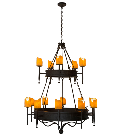 Welcome an elegant revival look into your home or business with the stunning, voluminous Marta Chandelier, which integrates a distinctive motif with classic styling. 15 Ivory faux candlelights are perched atop bobeches with long ballpoint stems on two decorative rings, highlighted in a stunning Oil Rubbed Bronze finish and a Barkerized texture. The Hand-Forged Iron chandelier completes an evocative impression with a compelling design and beautiful ambient illumination. Custom crafted in Yorkville, New York, by highly skilled artisans, this Grand styled fixture is available in custom finishes, sizes, colors, and dimmable energy-efficient lamping options. The 51-inch chandelier is UL and cUL listed for damp and dry locations.
