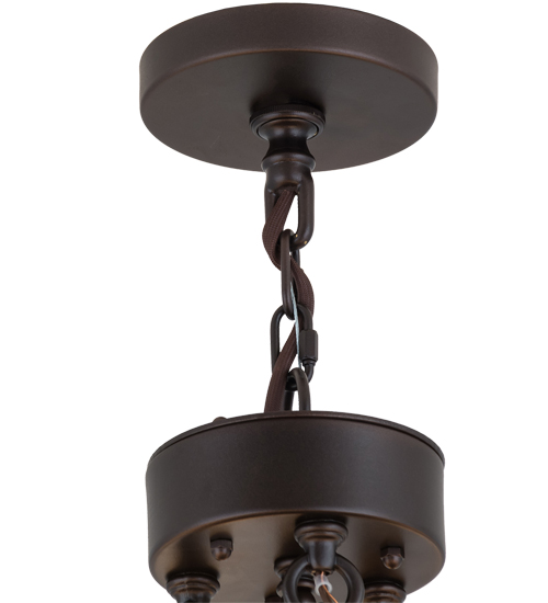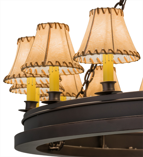 Inspired by the Arts and Crafts Movement while incorporating western influences, Sullivan Ranch features 27 Amber Faux candlelights on bobeches crowned with Tan Faux Rawhide-wrapped Leather shades. The chandelier features 9 shades on the top tier and 18 on the lower tier. The bold rugged round frame with matching hardware are hand finished in a warm Mahogany Bronze to complement the shades. The chandelier is handcrafted by artisans in Upstate New York and offered in custom sizes, styles and colors, and with dimmable energy-efficient lamping options. The fixture is UL and cUL listed for damp and dry locations.