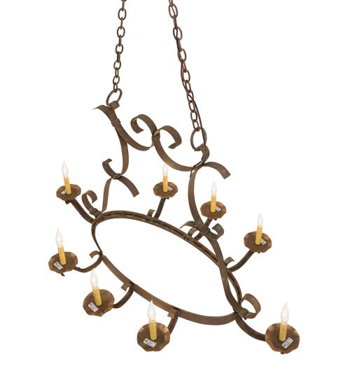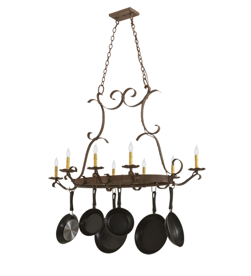 A handsome chandelier that doubles a lighted pot rack, Laramie features a sturdy rustic frame finished with a stunning Capri finish. Eight Ivory faux candlelights are supported by bobeches attached to curved arms while providing beautiful ambient illumination. The fixture is designed with hooks to display fine cookware and accessories in a culinary space. Ideal for residential and hospitality applications, this chandelier is custom crafted at our manufacturing facilities in Yorkville, New York. Custom colors, styles and finishes are available, as well as dimmable energy efficient lamping options including LED. The 53-inch long fixture is UL and cUL listed for dry and damp locations. (Cookware not included)