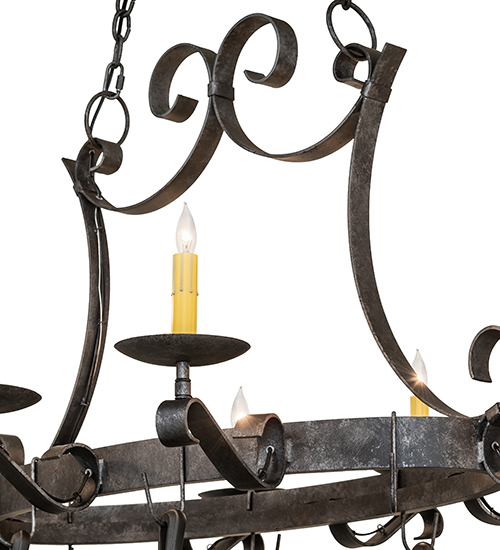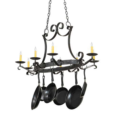A handsome chandelier that doubles a lighted pot rack. Laramie features a sturdy rustic frame finished with a stunning Blackened Pewter finish. Eight Ivory faux candlelights are supported by bobeches attached to curved arms while providing beautiful ambient illumination. The fixture is designed with hooks to display fine cookware. Overall height ranges from 41 to 93 inches as the chain length can be easily adjusted in the field to accommodate your specific lighting needs. Handcrafted in our 180,000 square foot manufacturing facility in Yorkville, New York. Shade colors, metal finishes and fixture sizes can be customized to your needs. UL and cUL listed for dry and damp locations.