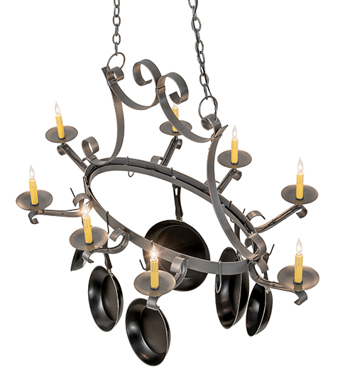 A handsome elaborate chandelier that doubles as a lighted pot rack. Laramie features a sturdy frame, and Hand-Forged Iron Scrollwork finished with a stunning Blackened Pewter finish. Eight Ivory faux candlelights perched on bobeches are attached to curved arms while providing beautiful ambient illumination. French wiring allows the electrical cord to run from the canopy directly through eyelets to each of the lamp holders. The fixture is designed with hooks to display fine cookware and accessories in a culinary space in residential settings from Orange Beach, Alabama, to Telluride, Colorado. The overall height ranges from 30 to 93 inches, as the chain length can be easily adjusted in the field to accommodate your specific lighting needs. The Laramie 8 Light Pot Rack is included in our American-made, American-designed, handcrafted Pot Rack Collection and manufactured in Yorkville, New York. UL and cUL listed for dry and damp locations. (Cookware not included).
