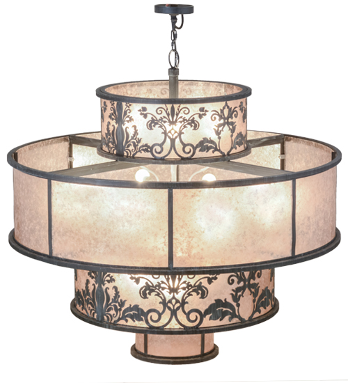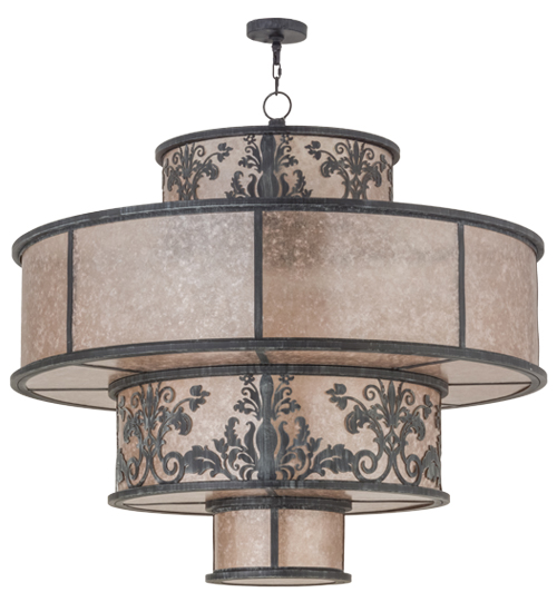 An exquisite four tier pendant features stunning Silver Mica diffusers with the top and third tiers accentuated with a floral and scroll design in an Antique Iron Gate finish. This luxurious pendant illuminates with energy efficient LEDs supplied by the owner. Custom crafted at our manufacturing facility in the USA, this fixture is available in custom sizes, styles and colors, as well as dimmable energy efficient lamping options. The fixture is UL and cUL listed for damp and dry locations.